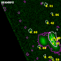 Object #1845 x,y = (1810, 2161) RA, Dec = (06:16:08.400, -57:49:15.24) = (94.03500, -57.82090) BPZ = 0.600 [0.227--4.026] type = 7.60 (SB1_B10 - Scd_B10) chisq2 = 0.01 ODDS = 0.14 z_cluster = 0.972