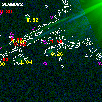 Object #18460 x,y = (5262, 6383) RA, Dec = (06:15:42.504, -57:45:02.16) = (93.92710, -57.75060) BPZ = 0.261 [0.066--2.934] type = 9.60 (SB3_B10 - SB2_B10) chisq2 = 0.01 ODDS = 0.19 z_cluster = 0.972