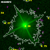Object #19796 x,y = (2143, 6156) RA, Dec = (06:16:05.880, -57:45:15.48) = (94.02450, -57.75430) BPZ = 0.365 [0.074--0.483] type = 7.00 (Scd_B10) chisq2 = 0.01 ODDS = 0.34 z_cluster = 0.972