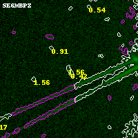 Object #2447 x,y = (4494, 2452) RA, Dec = (06:15:48.240, -57:48:57.96) = (93.95100, -57.81610) BPZ = 1.560 [0.192--3.759] type = 9.40 (SB2_B10 - SB3_B10) chisq2 = 0.00 ODDS = 0.08 z_cluster = 0.972