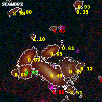 Object #5113 x,y = (4500, 3363) RA, Dec = (06:15:48.216, -57:48:03.24) = (93.95090, -57.80090) BPZ = 0.648 [0.549--0.706] type = 4.10 (Ell4_A_0 - ES0_B10) chisq2 = 0.07 ODDS = 0.88 z_cluster = 0.972