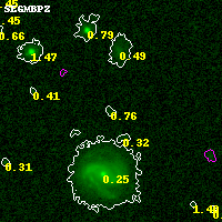 Object #6199 x,y = (7145, 3748) RA, Dec = (06:15:28.368, -57:47:40.20) = (93.86820, -57.79450) BPZ = 0.755 [0.316--4.295] type = 7.40 (Scd_B10 - SB1_B10) chisq2 = 0.01 ODDS = 0.14 z_cluster = 0.972