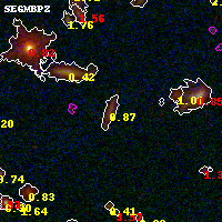 Object #7717 x,y = (3487, 4270) RA, Dec = (06:15:55.800, -57:47:08.88) = (93.98250, -57.78580) BPZ = 0.866 [0.420--1.057] type = 9.50 (SB3_B10 - SB2_B10) chisq2 = 0.28 ODDS = 0.43 z_cluster = 0.972