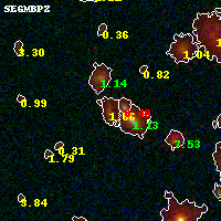 Object #8208 x,y = (3350, 4426) RA, Dec = (06:15:56.832, -57:46:59.52) = (93.98680, -57.78320) BPZ = 1.662 [1.262--1.788] type = 8.00 (SB1_B10) chisq2 = 0.07 ODDS = 0.70 z_cluster = 0.972