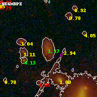 Object #8722 x,y = (4317, 4551) RA, Dec = (06:15:49.584, -57:46:51.96) = (93.95660, -57.78110) BPZ = 1.172 [1.114--1.251] type = 7.90 (SB1_B10 - Scd_B10) chisq2 = 0.02 ODDS = 0.98 z_cluster = 0.972