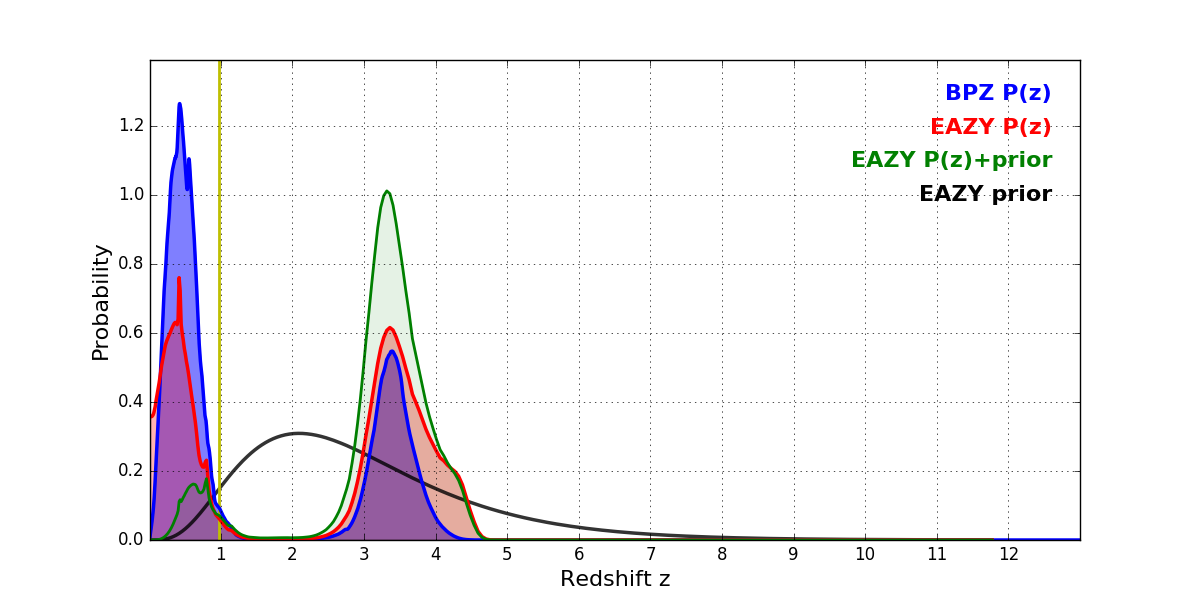 In P(z) plots: Yellow lines mark the cluster redshift z = 0.972,