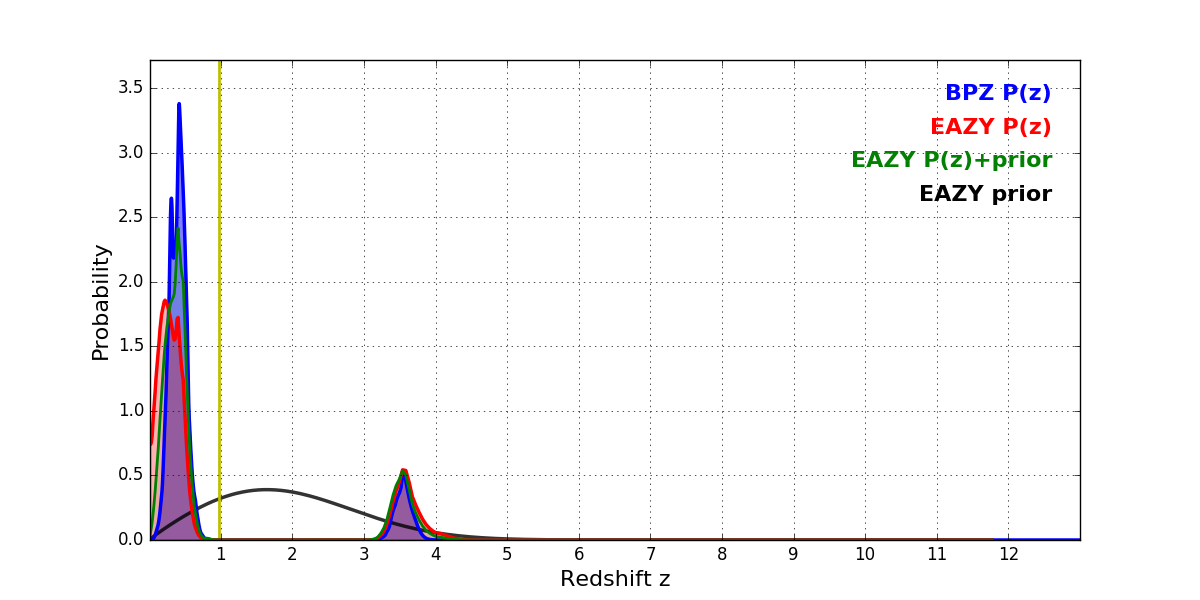 In P(z) plots: Yellow lines mark the cluster redshift z = 0.972,