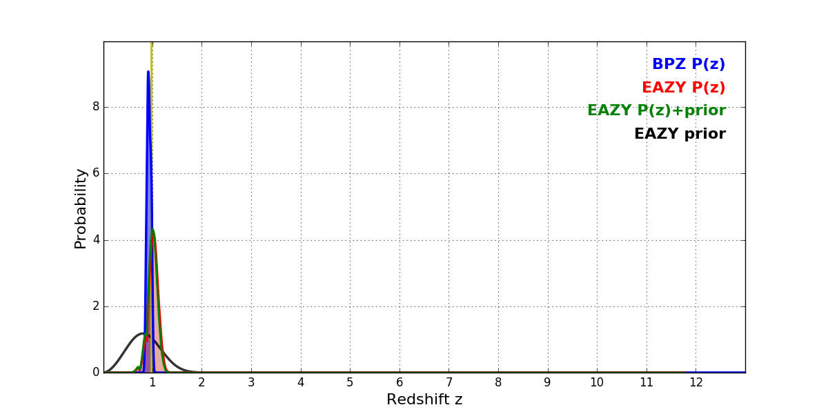 In P(z) plots: Yellow lines mark the cluster redshift z = 0.972,