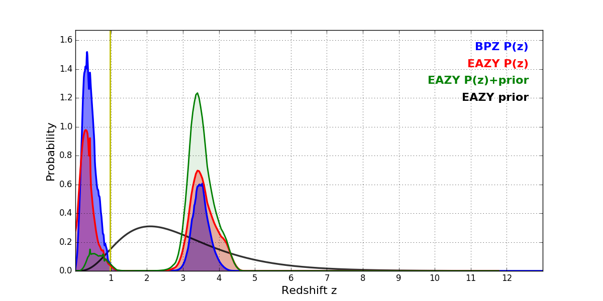 In P(z) plots: Yellow lines mark the cluster redshift z = 0.972,