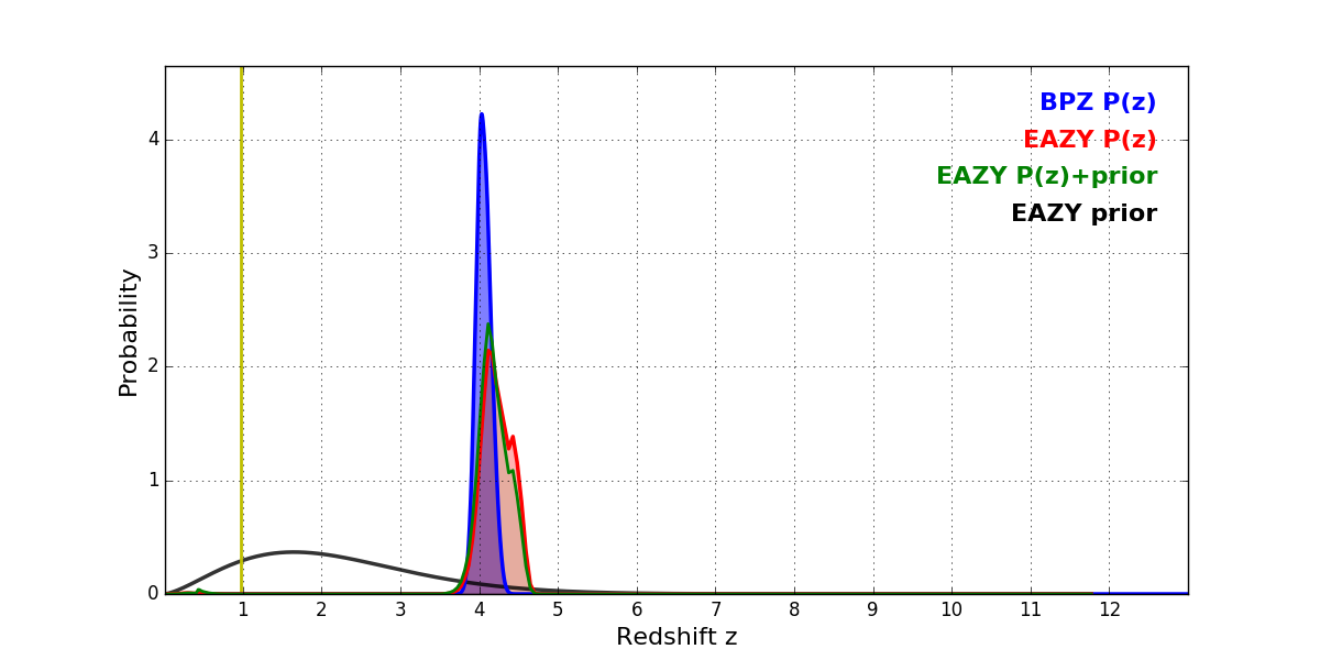 In P(z) plots: Yellow lines mark the cluster redshift z = 0.972,