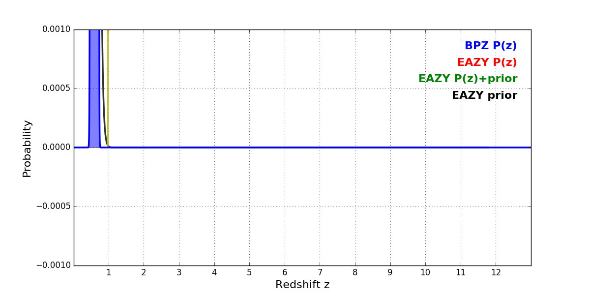 In P(z) plots: Yellow lines mark the cluster redshift z = 0.972,