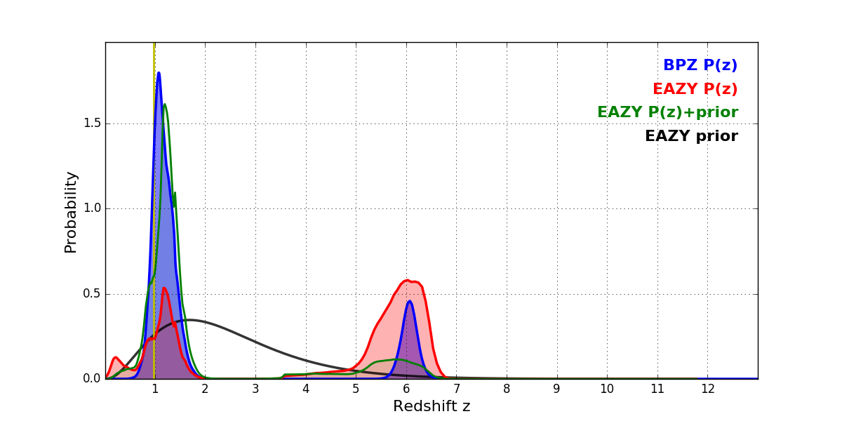 In P(z) plots: Yellow lines mark the cluster redshift z = 0.972,