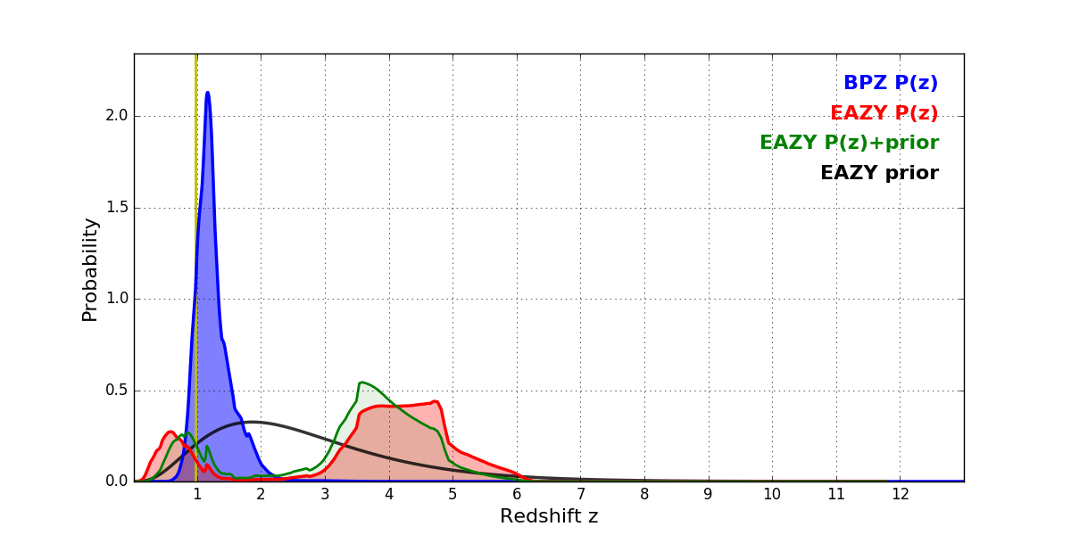 In P(z) plots: Yellow lines mark the cluster redshift z = 0.972,