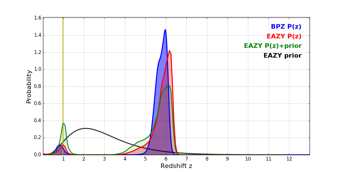 In P(z) plots: Yellow lines mark the cluster redshift z = 0.972,
