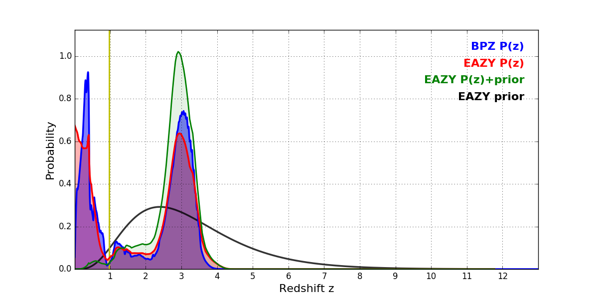 In P(z) plots: Yellow lines mark the cluster redshift z = 0.972,