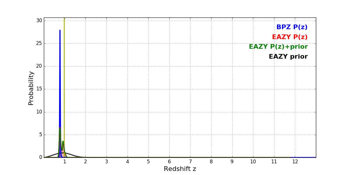 In P(z) plots: Yellow lines mark the cluster redshift z = 0.972,