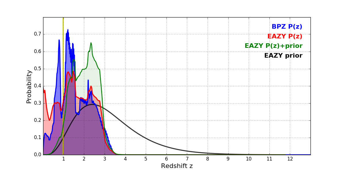 In P(z) plots: Yellow lines mark the cluster redshift z = 0.972,