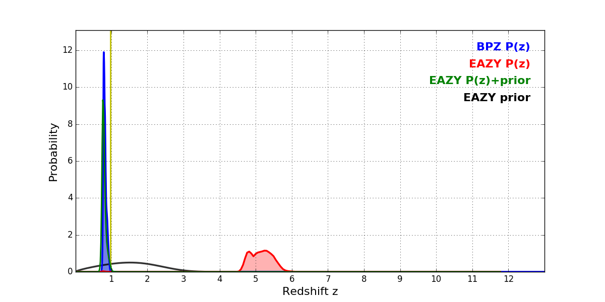 In P(z) plots: Yellow lines mark the cluster redshift z = 0.972,
