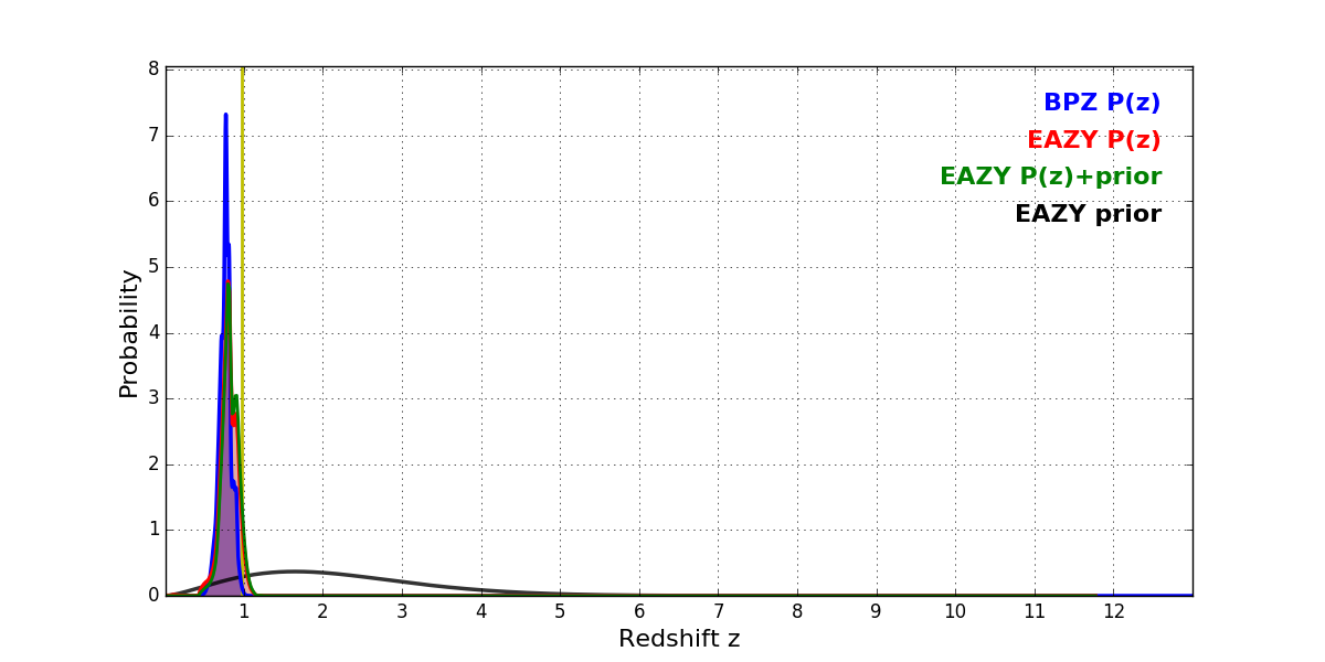 In P(z) plots: Yellow lines mark the cluster redshift z = 0.972,