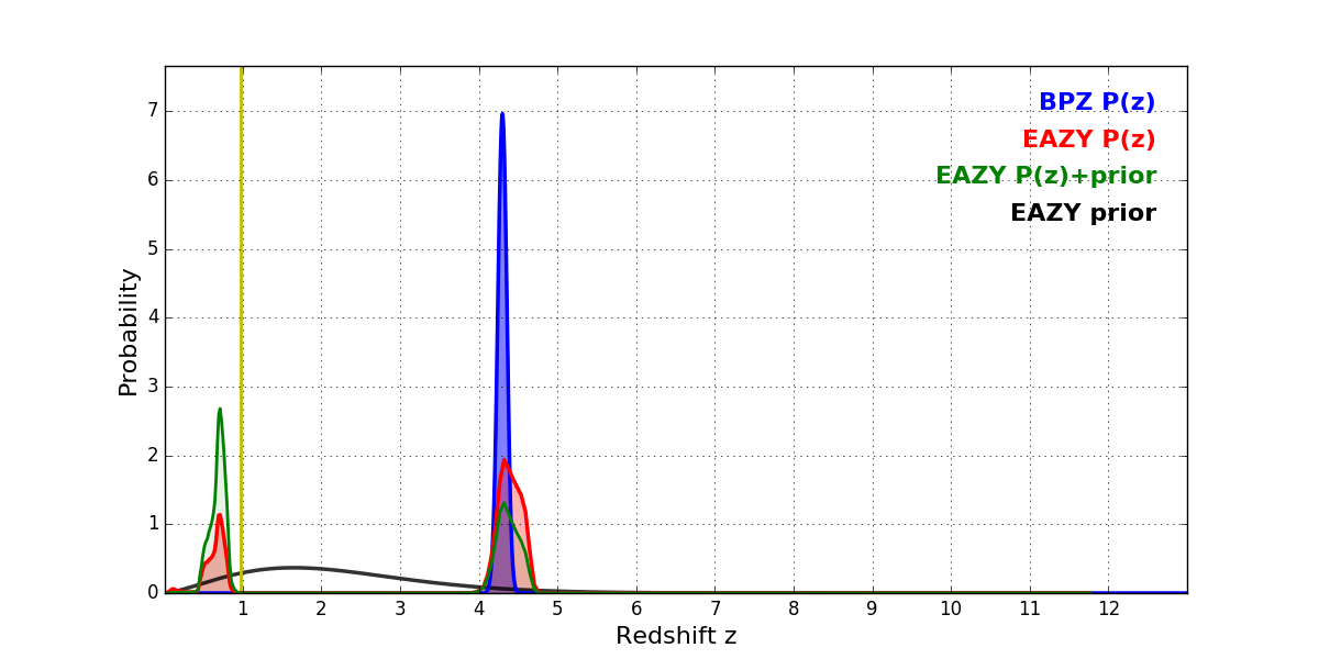 In P(z) plots: Yellow lines mark the cluster redshift z = 0.972,