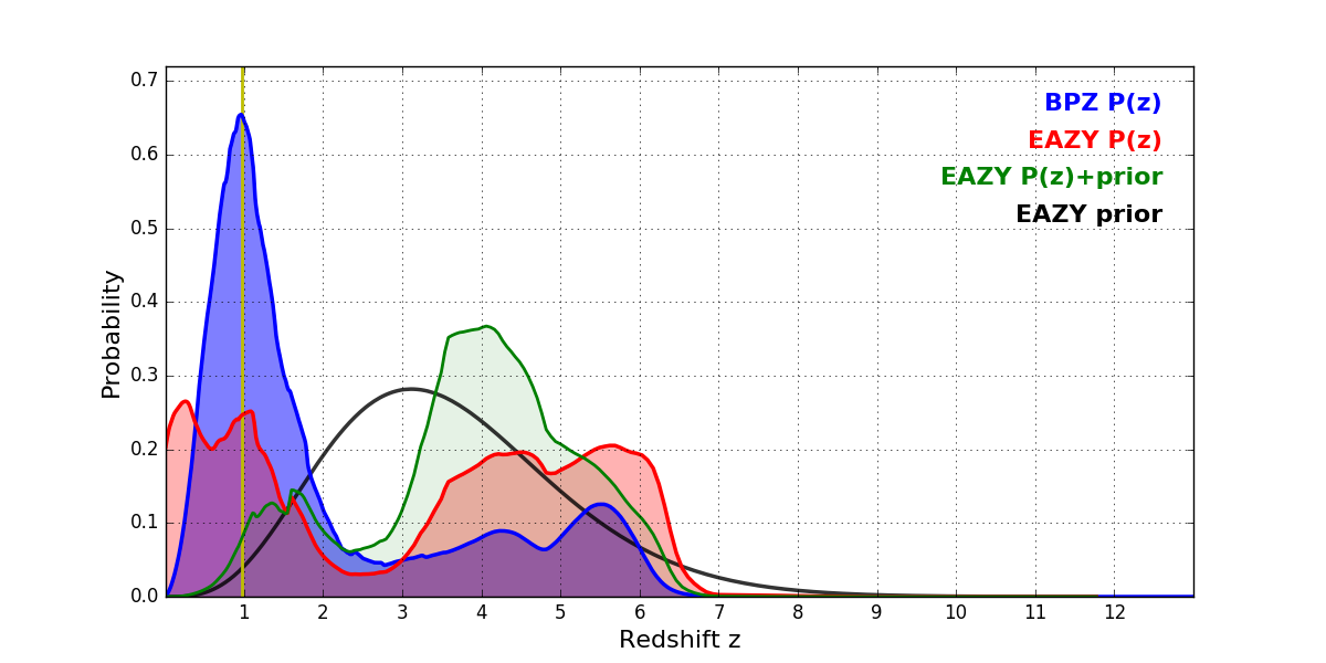 In P(z) plots: Yellow lines mark the cluster redshift z = 0.972,