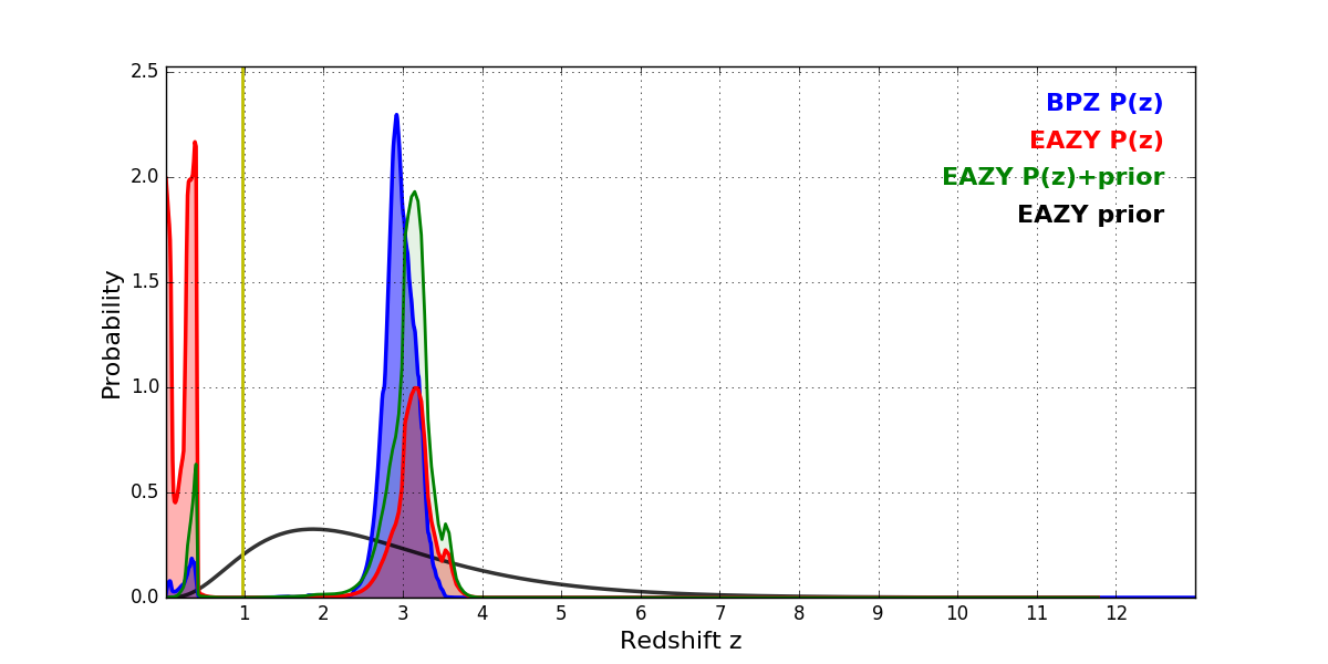 In P(z) plots: Yellow lines mark the cluster redshift z = 0.972,