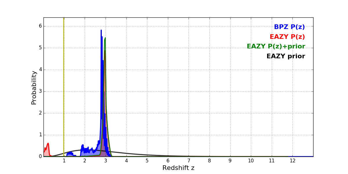 In P(z) plots: Yellow lines mark the cluster redshift z = 0.972,