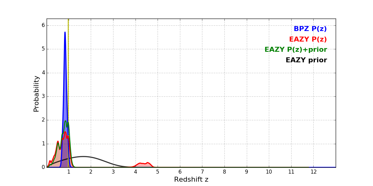 In P(z) plots: Yellow lines mark the cluster redshift z = 0.972,