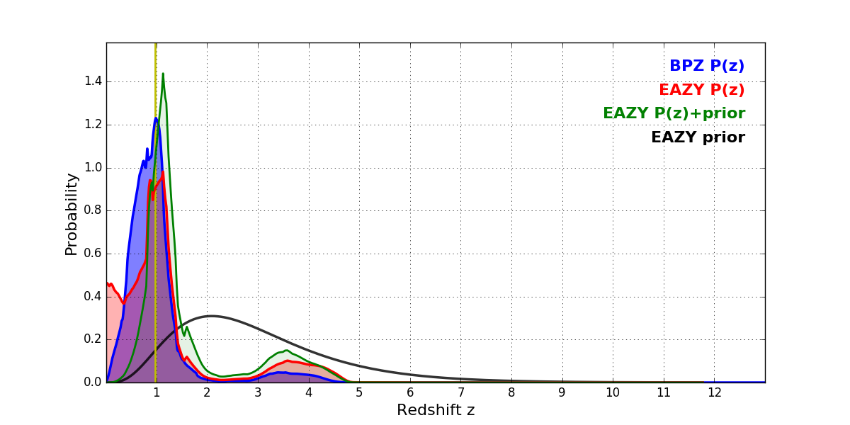 In P(z) plots: Yellow lines mark the cluster redshift z = 0.972,
