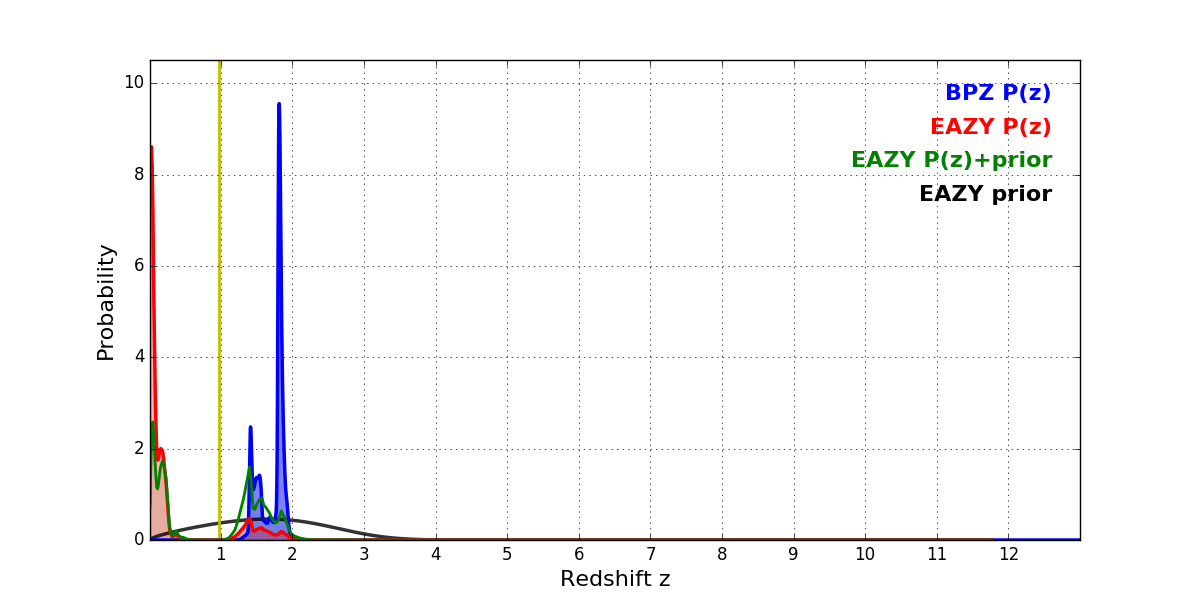 In P(z) plots: Yellow lines mark the cluster redshift z = 0.972,