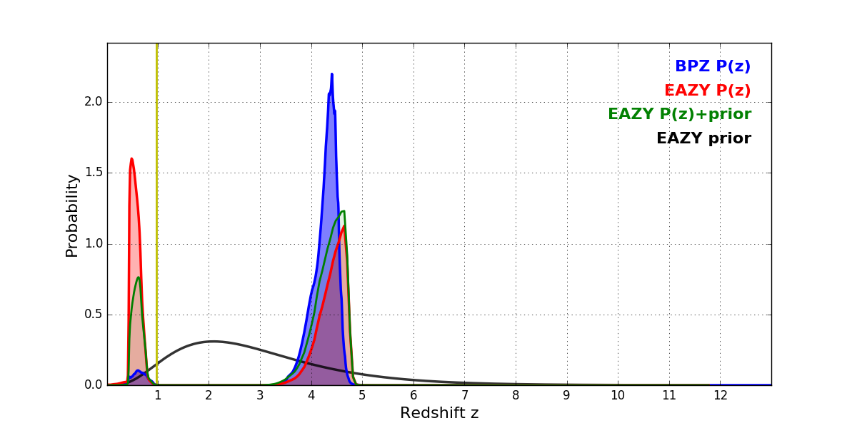 In P(z) plots: Yellow lines mark the cluster redshift z = 0.972,
