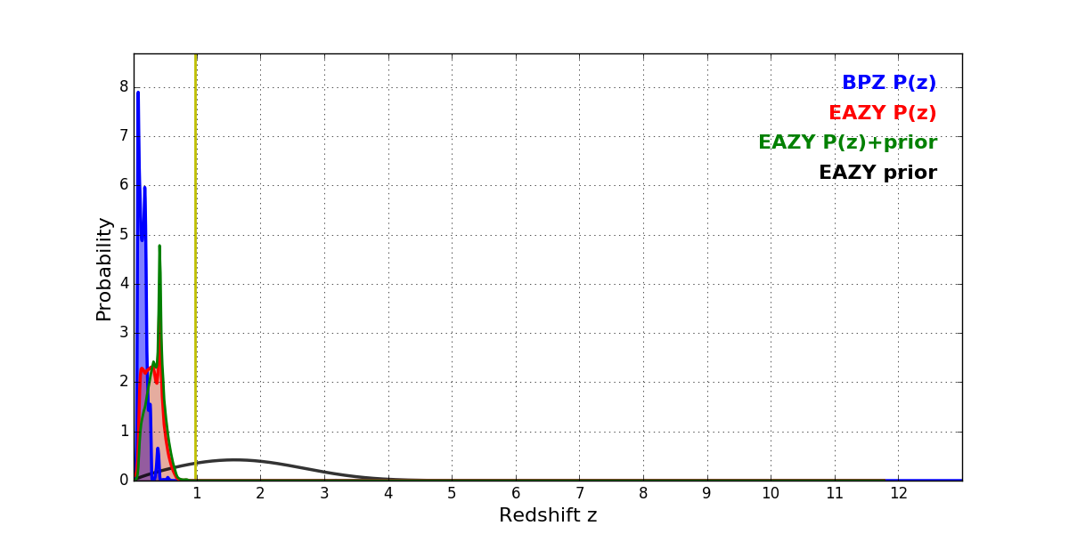 In P(z) plots: Yellow lines mark the cluster redshift z = 0.972,