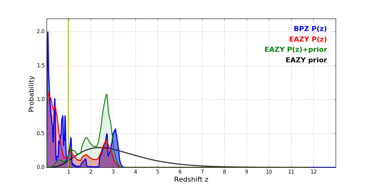 In P(z) plots: Yellow lines mark the cluster redshift z = 0.972,