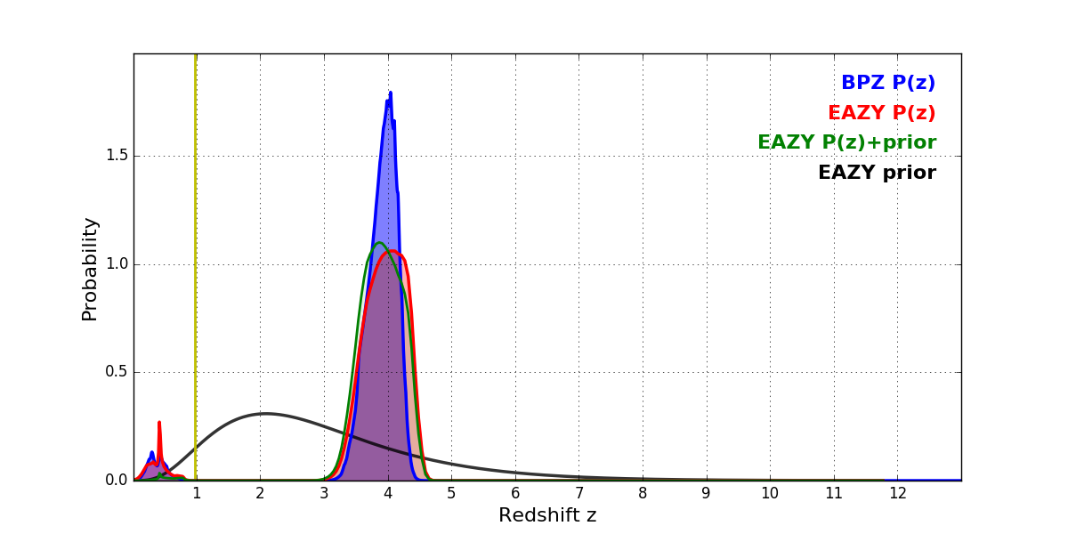 In P(z) plots: Yellow lines mark the cluster redshift z = 0.972,
