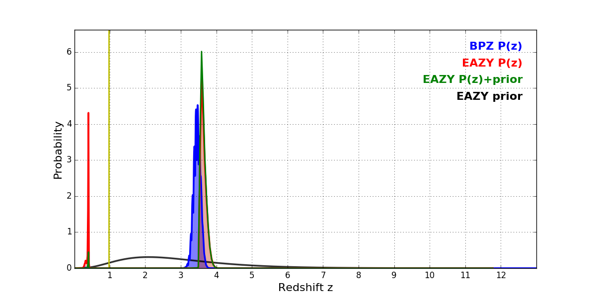In P(z) plots: Yellow lines mark the cluster redshift z = 0.972,