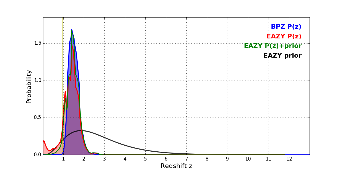 In P(z) plots: Yellow lines mark the cluster redshift z = 0.972,