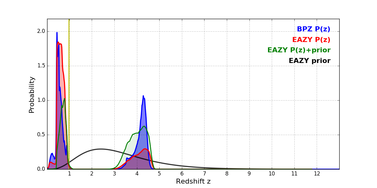 In P(z) plots: Yellow lines mark the cluster redshift z = 0.972,