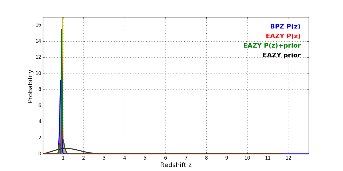 In P(z) plots: Yellow lines mark the cluster redshift z = 0.972,