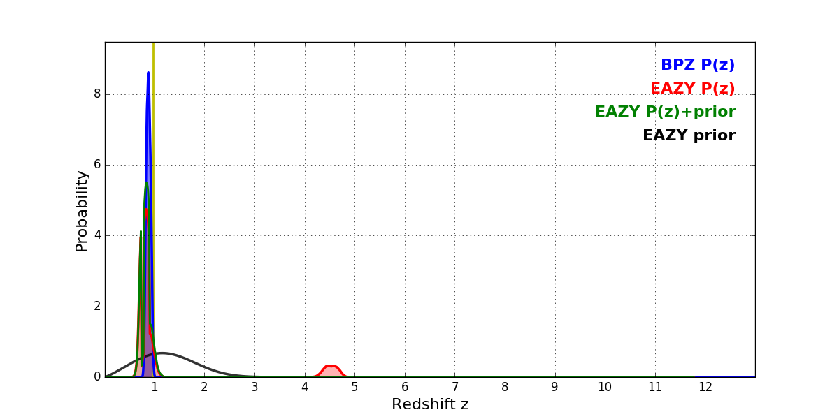 In P(z) plots: Yellow lines mark the cluster redshift z = 0.972,