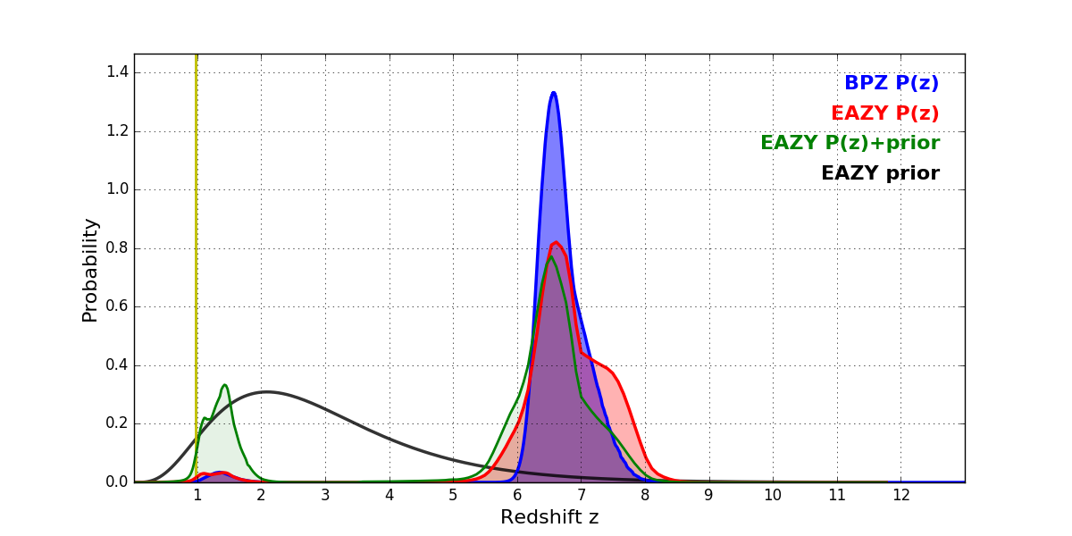 In P(z) plots: Yellow lines mark the cluster redshift z = 0.972,