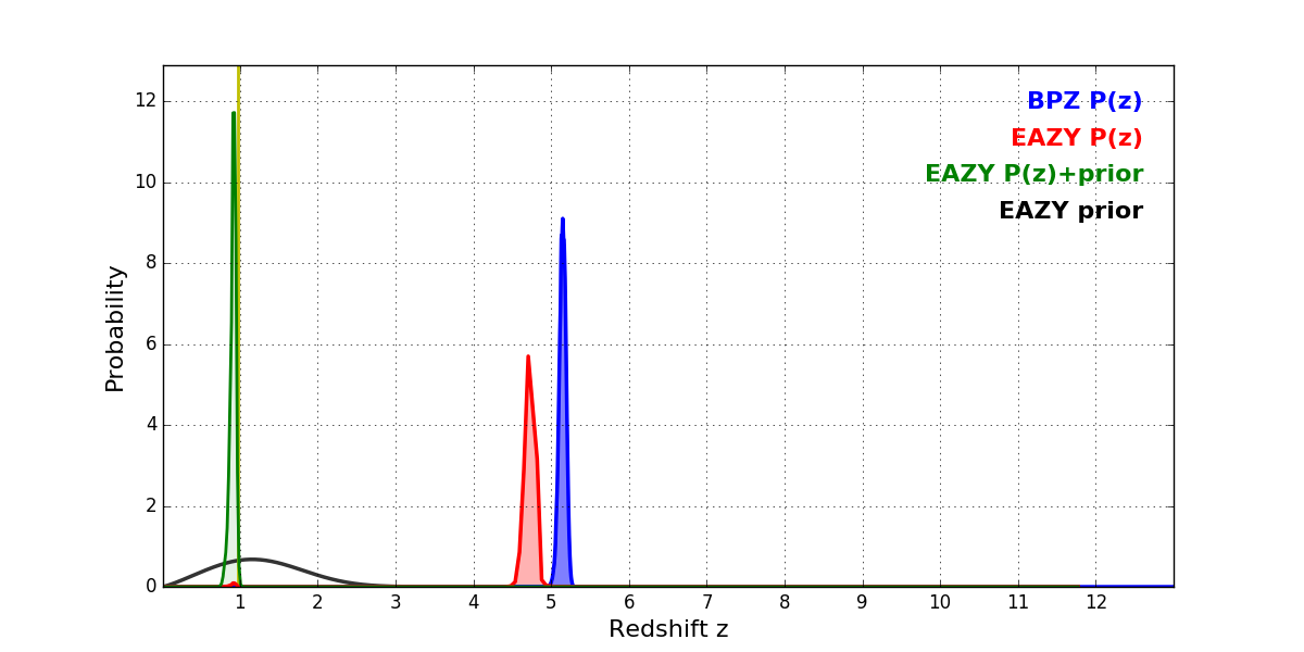 In P(z) plots: Yellow lines mark the cluster redshift z = 0.972,
