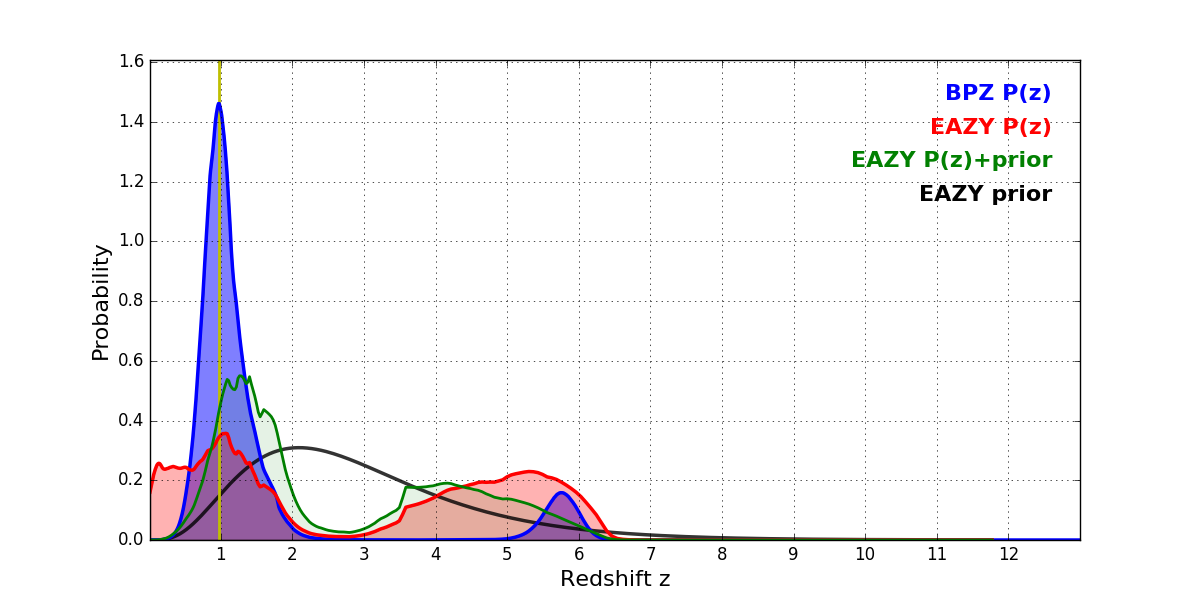 In P(z) plots: Yellow lines mark the cluster redshift z = 0.972,