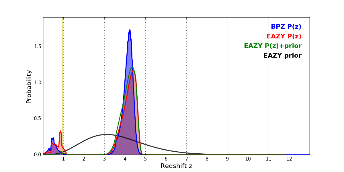 In P(z) plots: Yellow lines mark the cluster redshift z = 0.972,