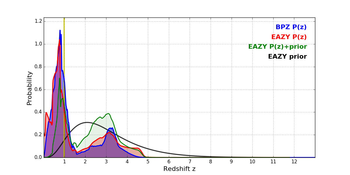 In P(z) plots: Yellow lines mark the cluster redshift z = 0.972,