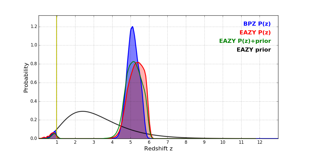 In P(z) plots: Yellow lines mark the cluster redshift z = 0.972,