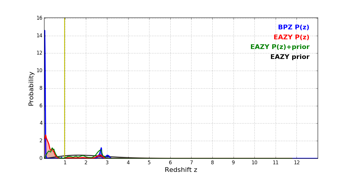 In P(z) plots: Yellow lines mark the cluster redshift z = 0.972,