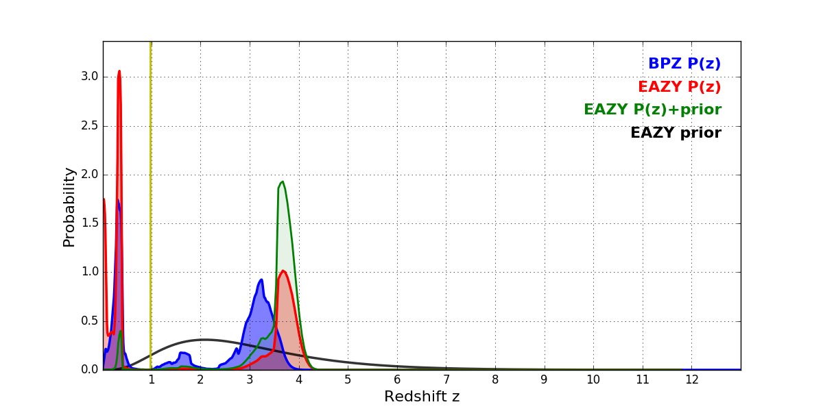 In P(z) plots: Yellow lines mark the cluster redshift z = 0.972,