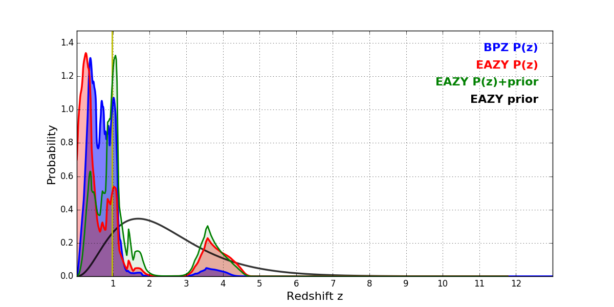In P(z) plots: Yellow lines mark the cluster redshift z = 0.972,