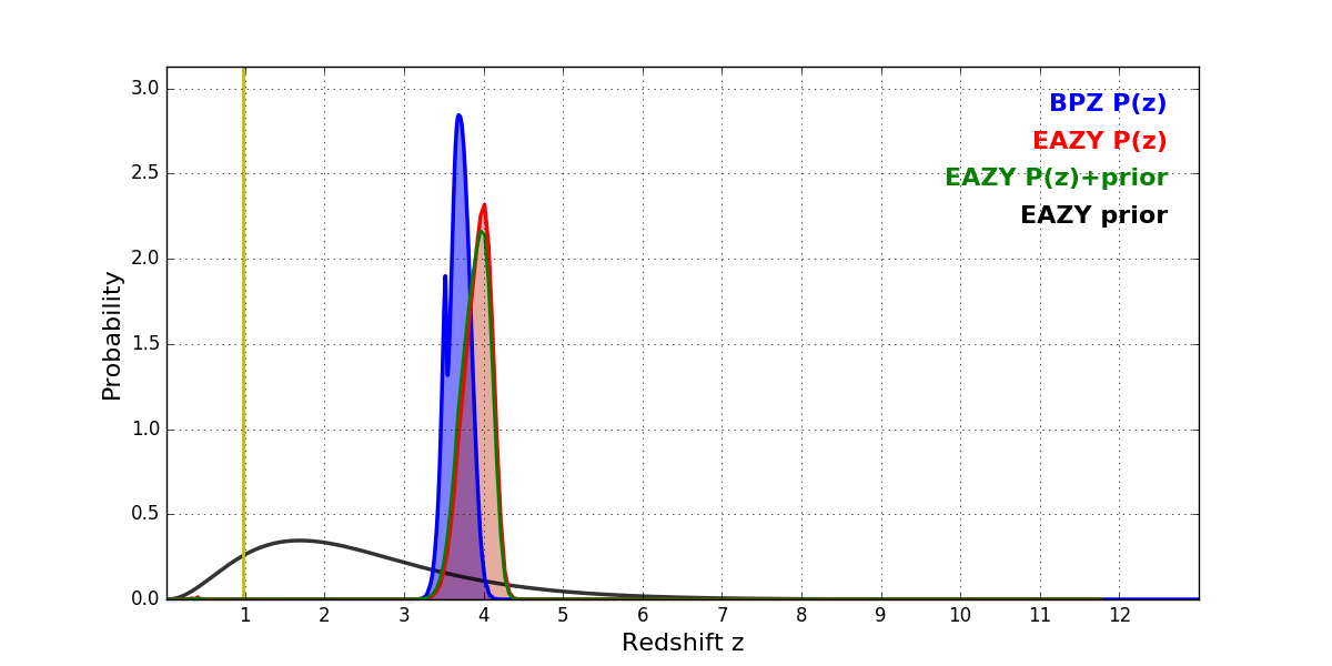 In P(z) plots: Yellow lines mark the cluster redshift z = 0.972,