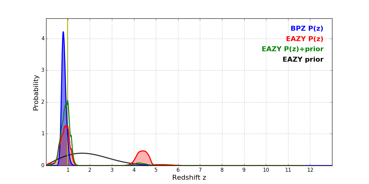 In P(z) plots: Yellow lines mark the cluster redshift z = 0.972,